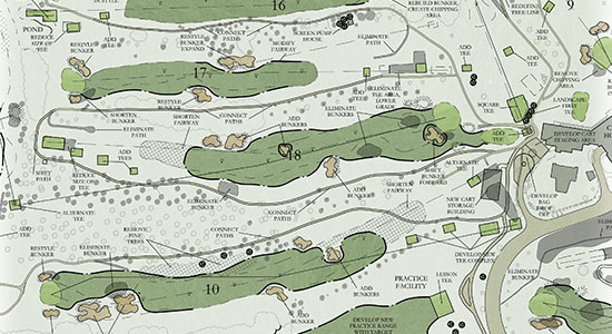 G+G was retained to develop a course master plan for this 1967 Geoffrey Cornish private club. Front nine pace of play and hole sequence were reviewed and led to the proposed changes in hole length and par. Alpine’s most influential feature that effects play and aesthetics is their bunkers. Master plan changes included bunker additions, eliminations and shifting to enhance strategy and improve aesthetics. Initial improvements were made in spring 2013 and included forward and rear tees construction in preparation for the RI Open.