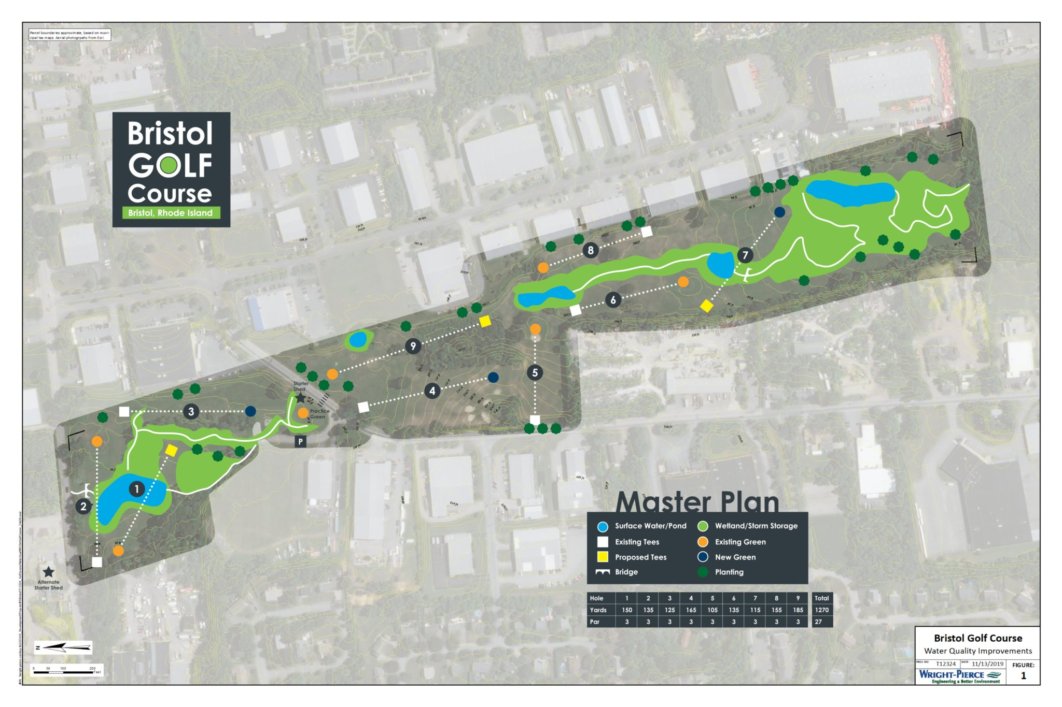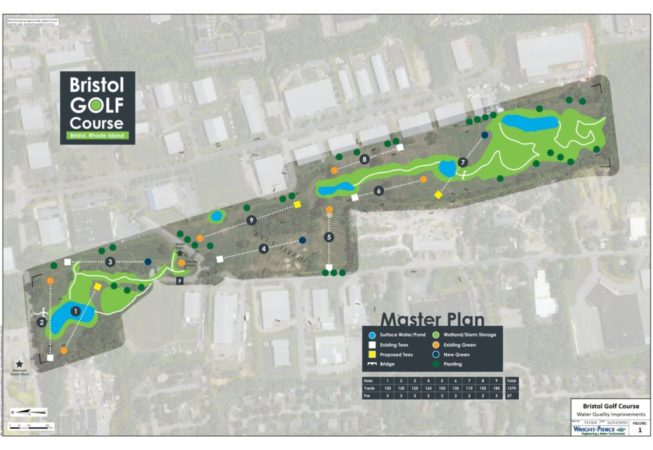 Seeing an opportunity, the Town of Bristol, who leases to a management company, assembled a group of interested stakeholders from Save Bristol Harbor, Save the Bay, RIDEM, and the Town administration, among others. Utilizing several grant awards and matching funds, Tim was able to put together a project that addressed many of the course issues. Though he wished he could do more about the inherently unique aesthetic, through the master plan process, he developed a nine-hole par-three course that eliminated the awkward holes. The plan also eliminated the wall-to-wall mown turf, and created sinuous swales to move stormwater more efficiently and help dry the soil, capturing stormwater, filtering it, and re-purposing it for irrigation. With player needs in mind, especially in a scenario in which many of the players will be less accomplished, he chose plantings with native species that did not hinder visibility. Planting locations also created habitat for songbirds and pollinators, while also being unfriendly to geese.