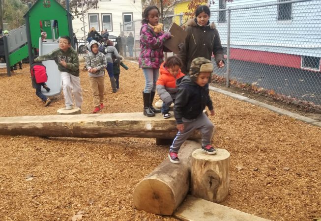 Honoring a former Providence Teacher of the Year, this small urban park had been passed over for at least 25 years. Working with the Providence Parks Department, we developed a plan to rejuvenate the 2-5 year old space with natural play elements. The fence to fence re-build relocated swings, added wood stepping stumps and planks, a Kompan play structure, climbing structure, sand pit, benches and a ornamental fence. This short section of fence draws visibility to the park dominated with the areas chain link.