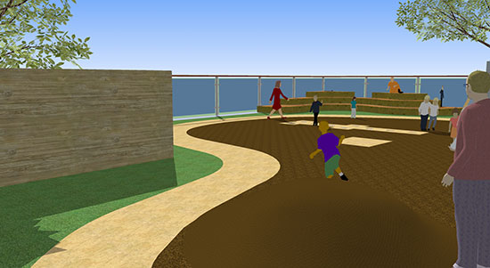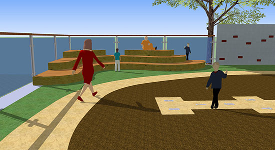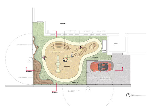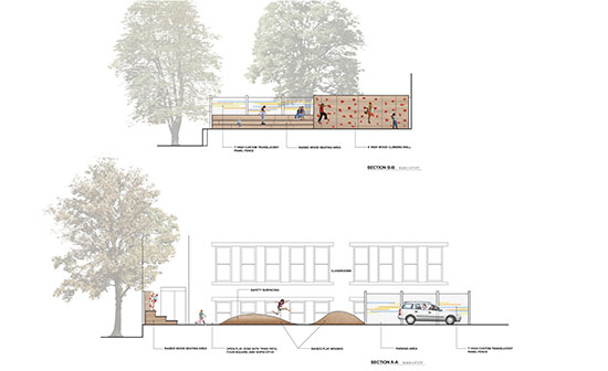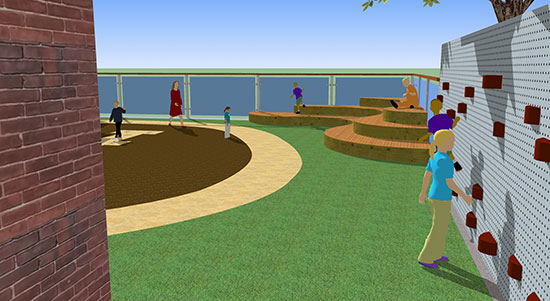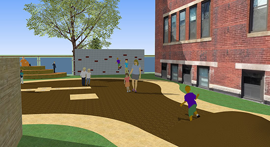 Design services were retained for development of a multi-purpose outdoor courtyard to accommodate both play and classroom activities. The 3,000 square foot area has been conceptually designed with a biomorphic amphitheatre, climbing wall, tricycle track, and hopscotch pad all enclosed with custom fencing. Challenges to the project include development over a roof membrane, access and enclosure, and adjacencies to existing classroom space and residential abutters.