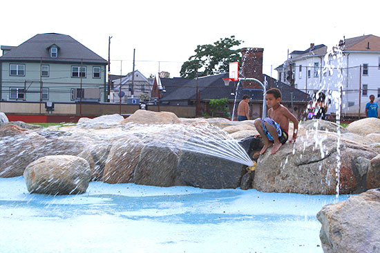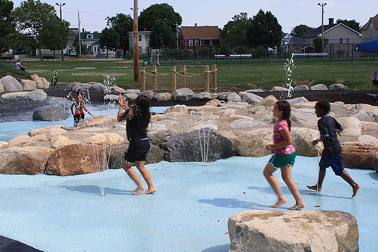 This exciting new spray park is located in Joslin Park behind the William D’Abate Elementary School in the Olneyville neighborhood of Providence. Gardner + Gerrish designed an alternate form of spray park that allows for multi seasonal use for the community. The dynamic facility replaced an aging and debilitated pool complex. Exposing urban children to adventure play was the driving force in the conceptual design. A native boulder strewn ‘stream’ for climbing and negotiating was part of the spray pad development integrated with a playground design with slides, “dock” and “bridge” over the spray pads outlet.