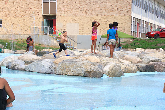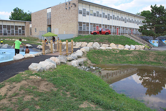 All spray pad water drains and is captured into a green infrastructure bio-retention area, thus providing 100% on-site infiltration.