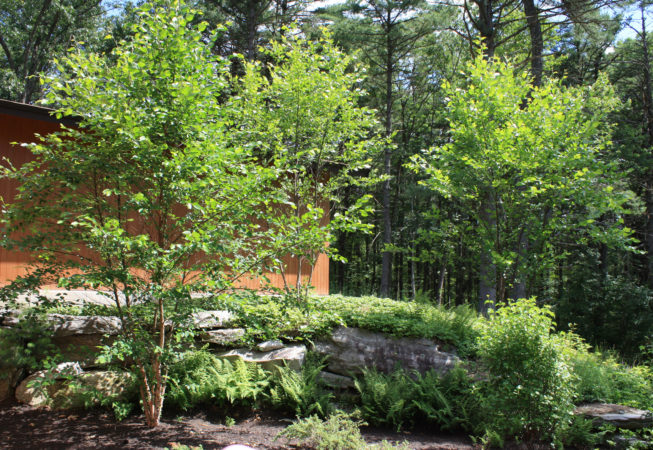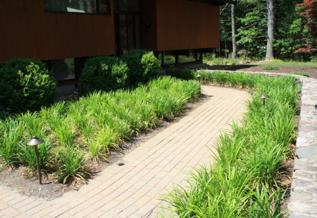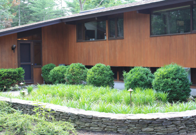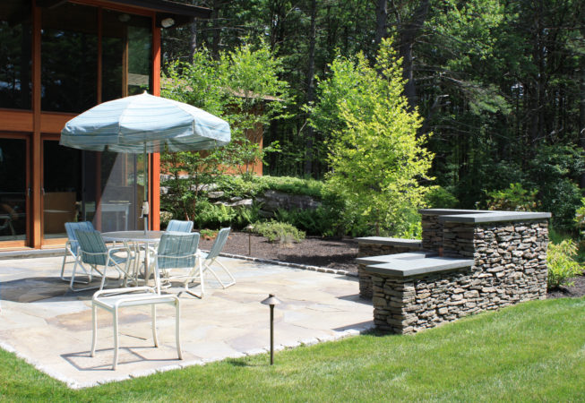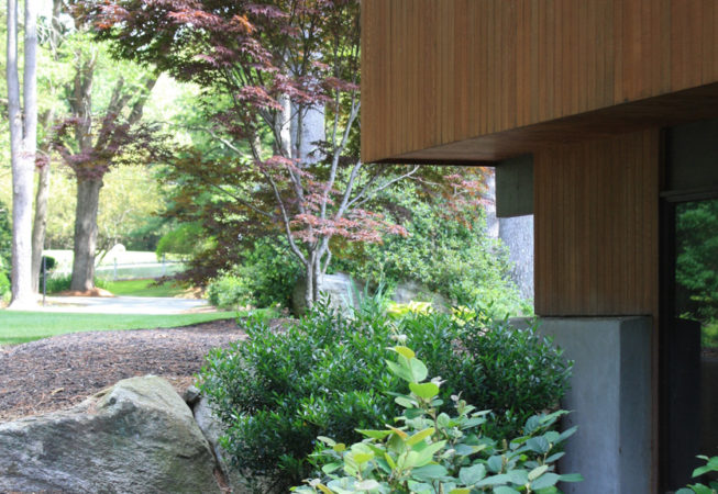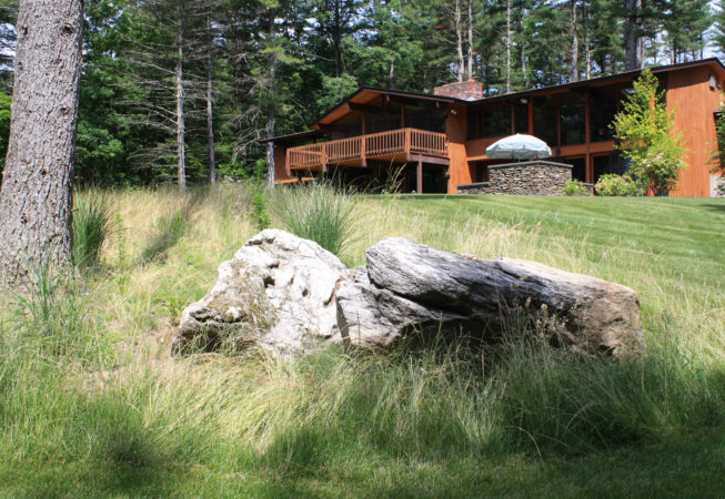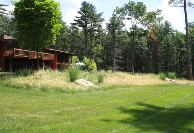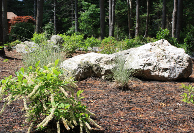 This wooded residence was selectively cleared of mature pine forest in order to create a more open design for the current owner. Selective plantings were retained and others relocated along edges to allow for light and views towards the residence. Native plant species are juxtaposed with granite boulders in groupings at the perimeter of delineated lawn areas. To the rear of the property, additional plantings are located along a bluestone terrace which opens to expansive lawn areas. The existing slope was retained and planted with ornamental grasses interspersed with boulders and a lower lawn terrace abuts the mature pine tree line.