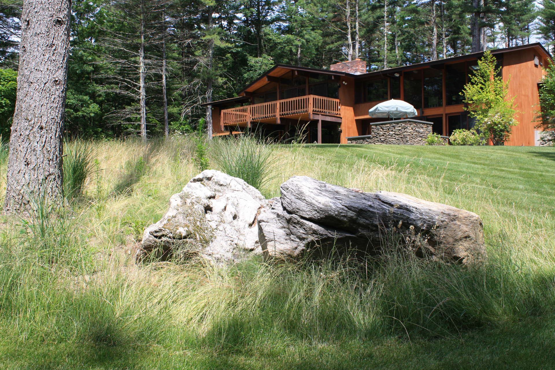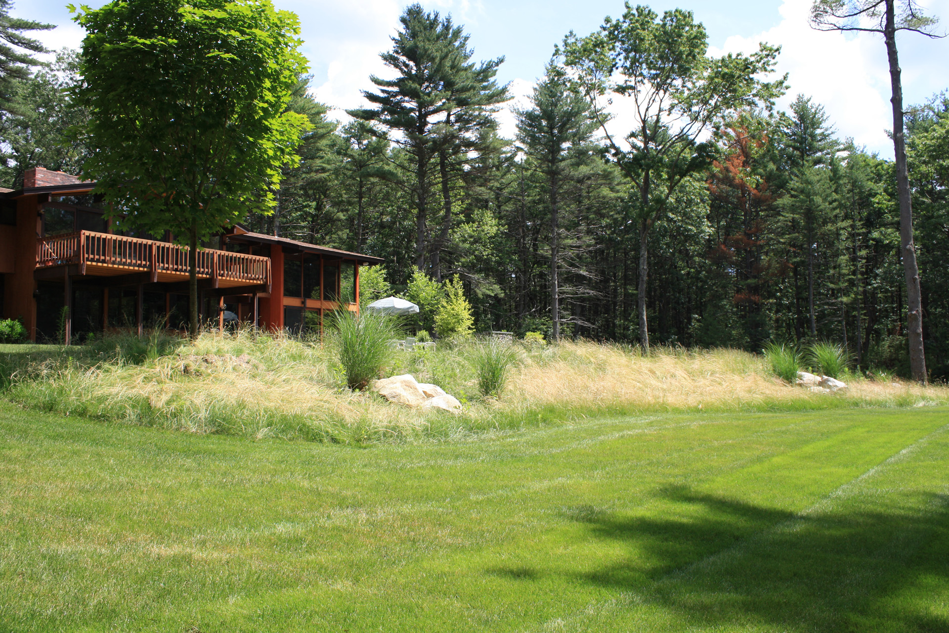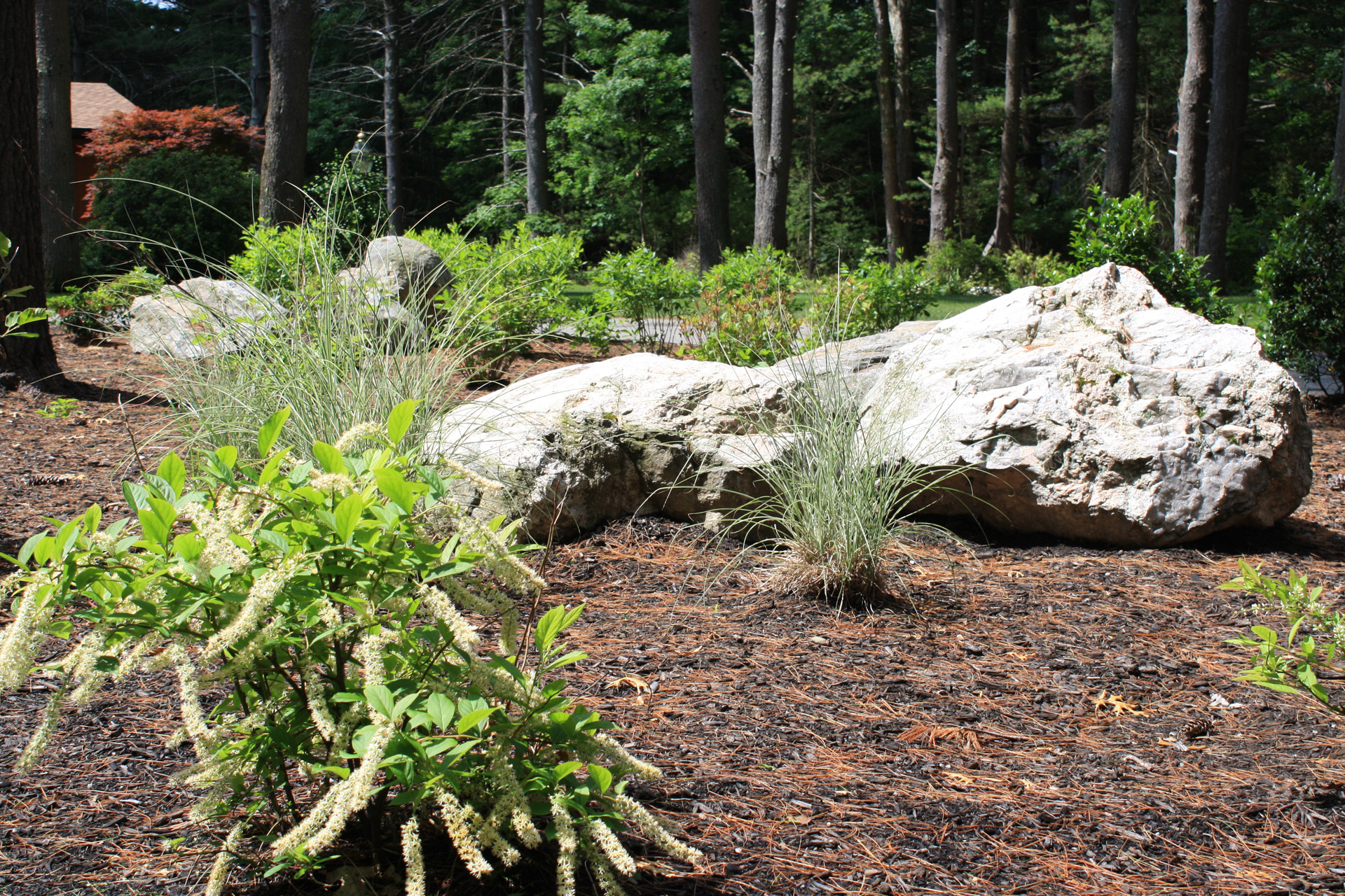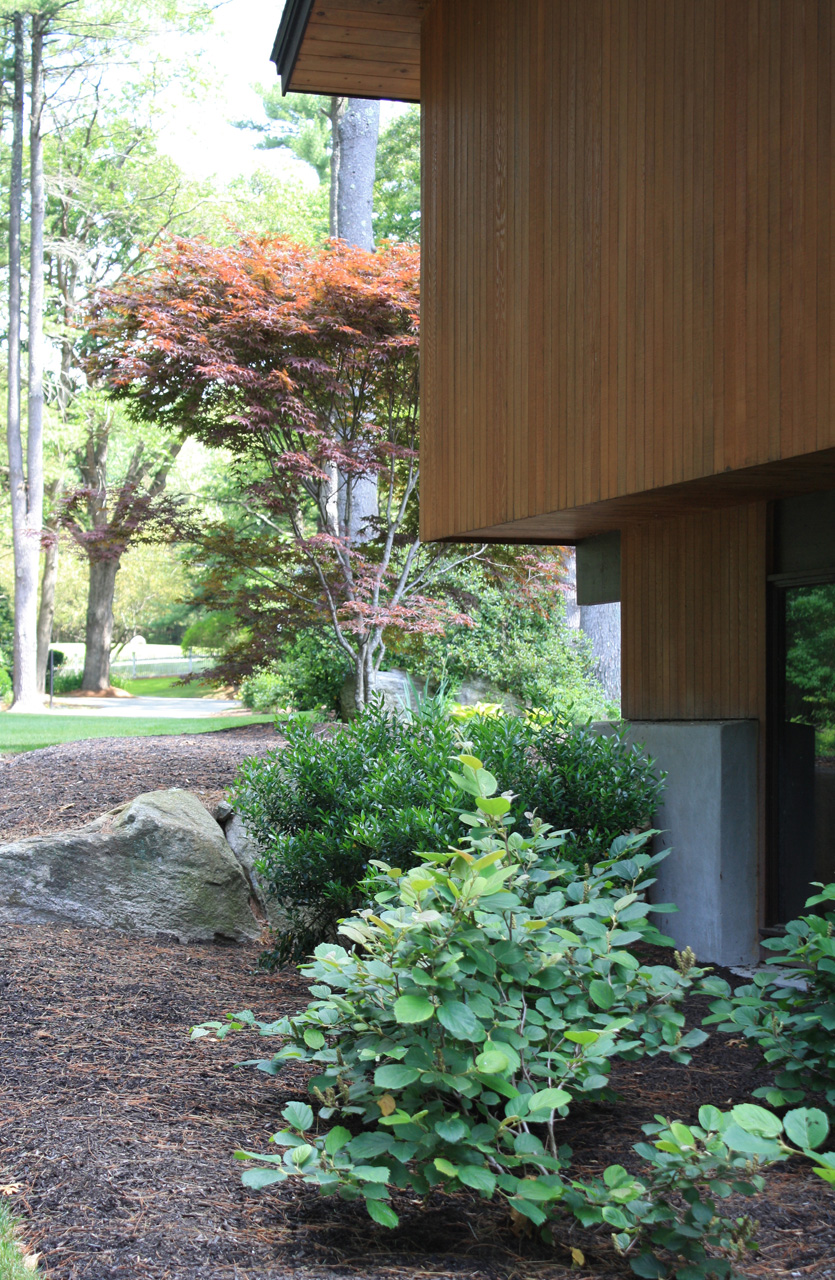 This wooded residence was selectively cleared of mature pine forest in order to create a more open design for the current owner. Selective plantings were retained and others relocated along edges to allow for light and views towards the residence. Native plant species are juxtaposed with granite boulders in groupings at the perimeter of delineated lawn areas. To the rear of the property, additional plantings are located along a bluestone terrace which opens to expansive lawn areas. The existing slope was retained and planted with ornamental grasses interspersed with boulders and a lower lawn terrace abuts the mature pine tree line.