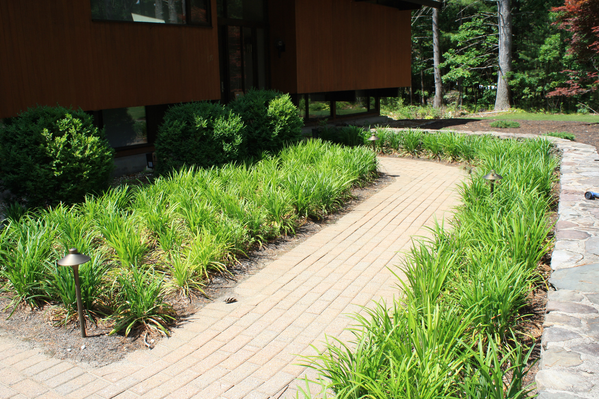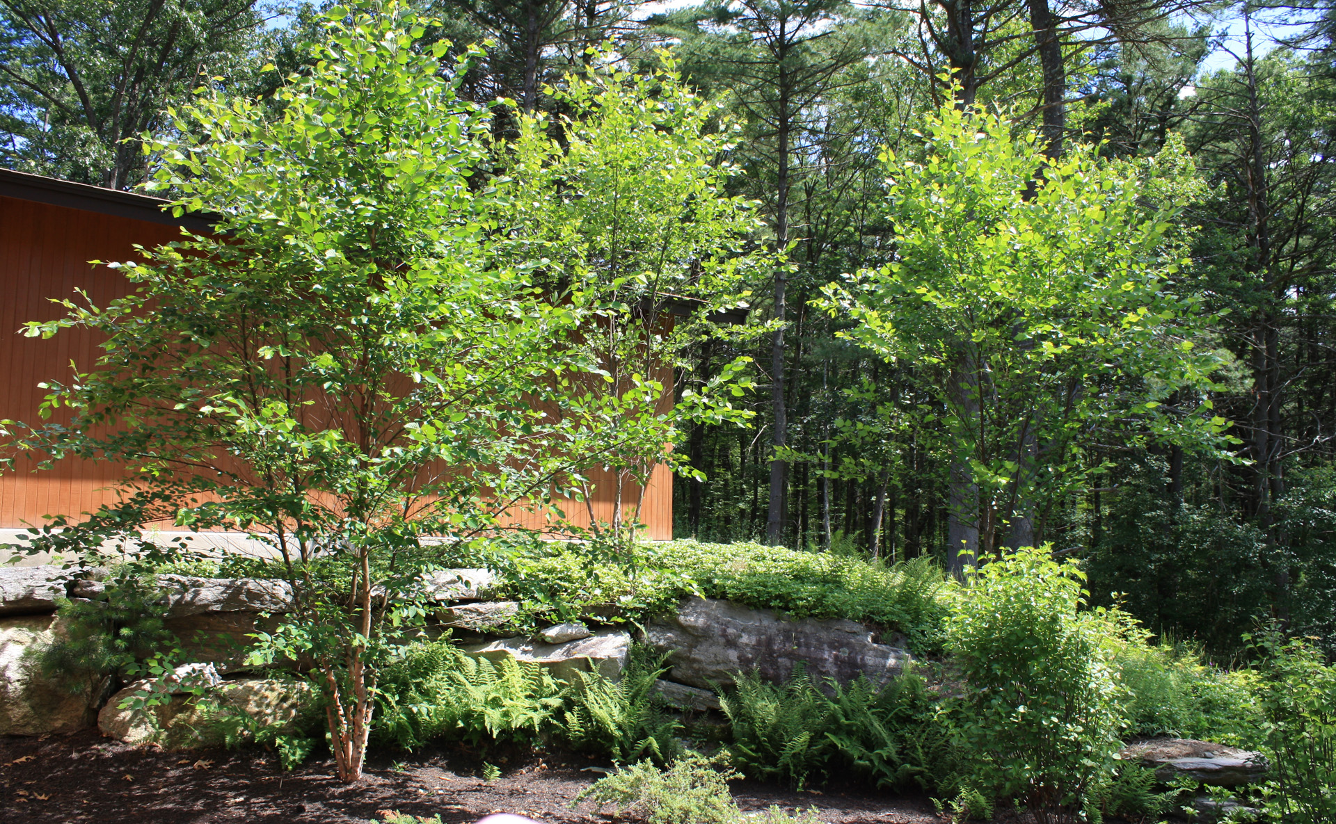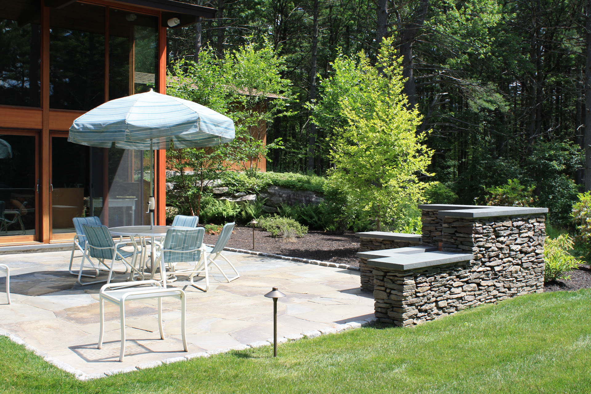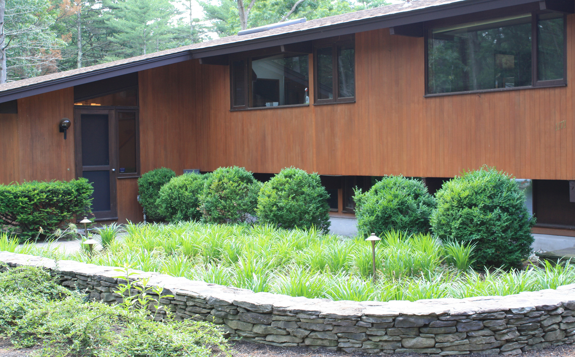 This wooded residence was selectively cleared of mature pine forest in order to create a more open design for the current owner. Selective plantings were retained and others relocated along edges to allow for light and views towards the residence. Native plant species are juxtaposed with granite boulders in groupings at the perimeter of delineated lawn areas. To the rear of the property, additional plantings are located along a bluestone terrace which opens to expansive lawn areas. The existing slope was retained and planted with ornamental grasses interspersed with boulders and a lower lawn terrace abuts the mature pine tree line.