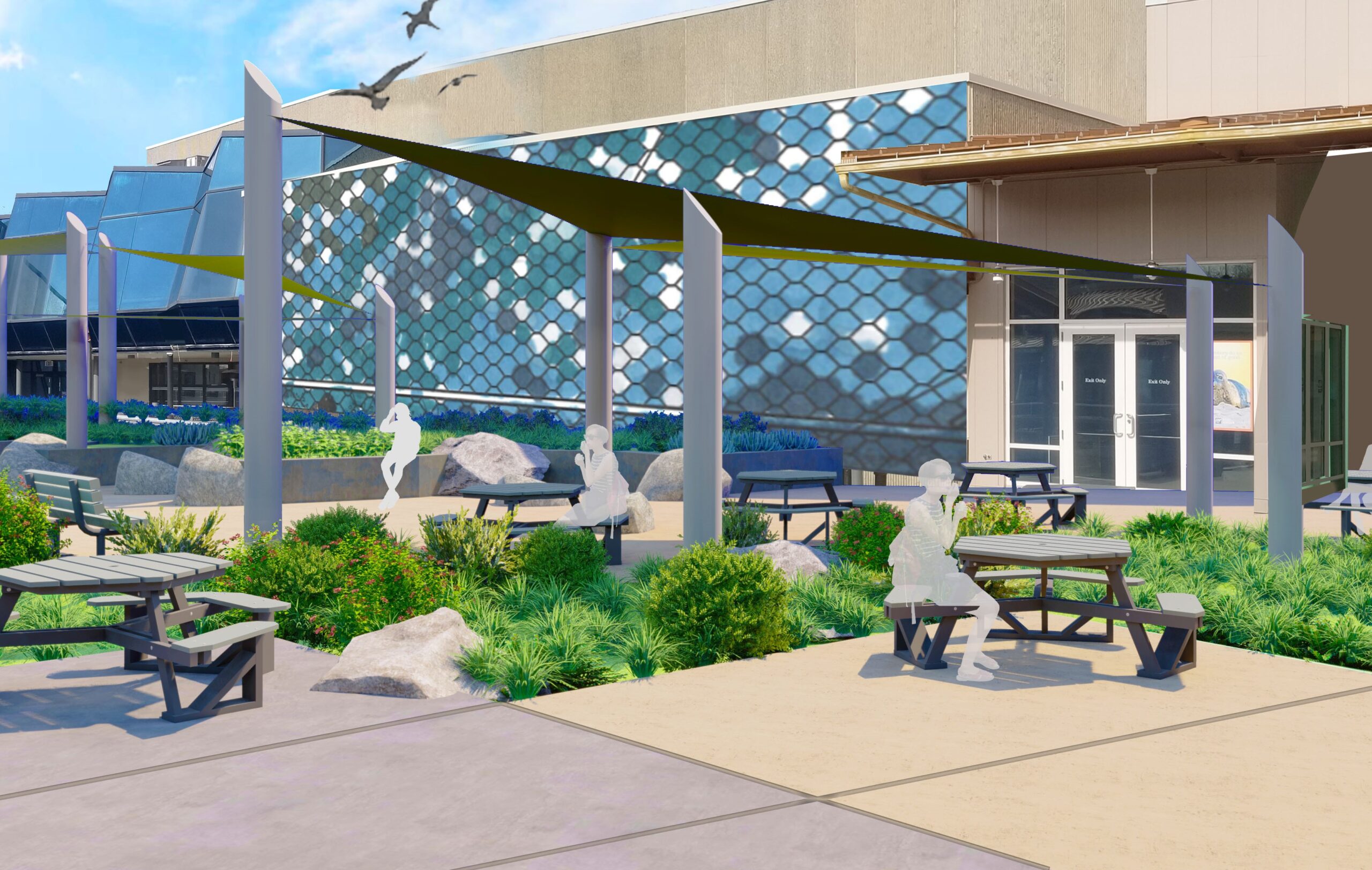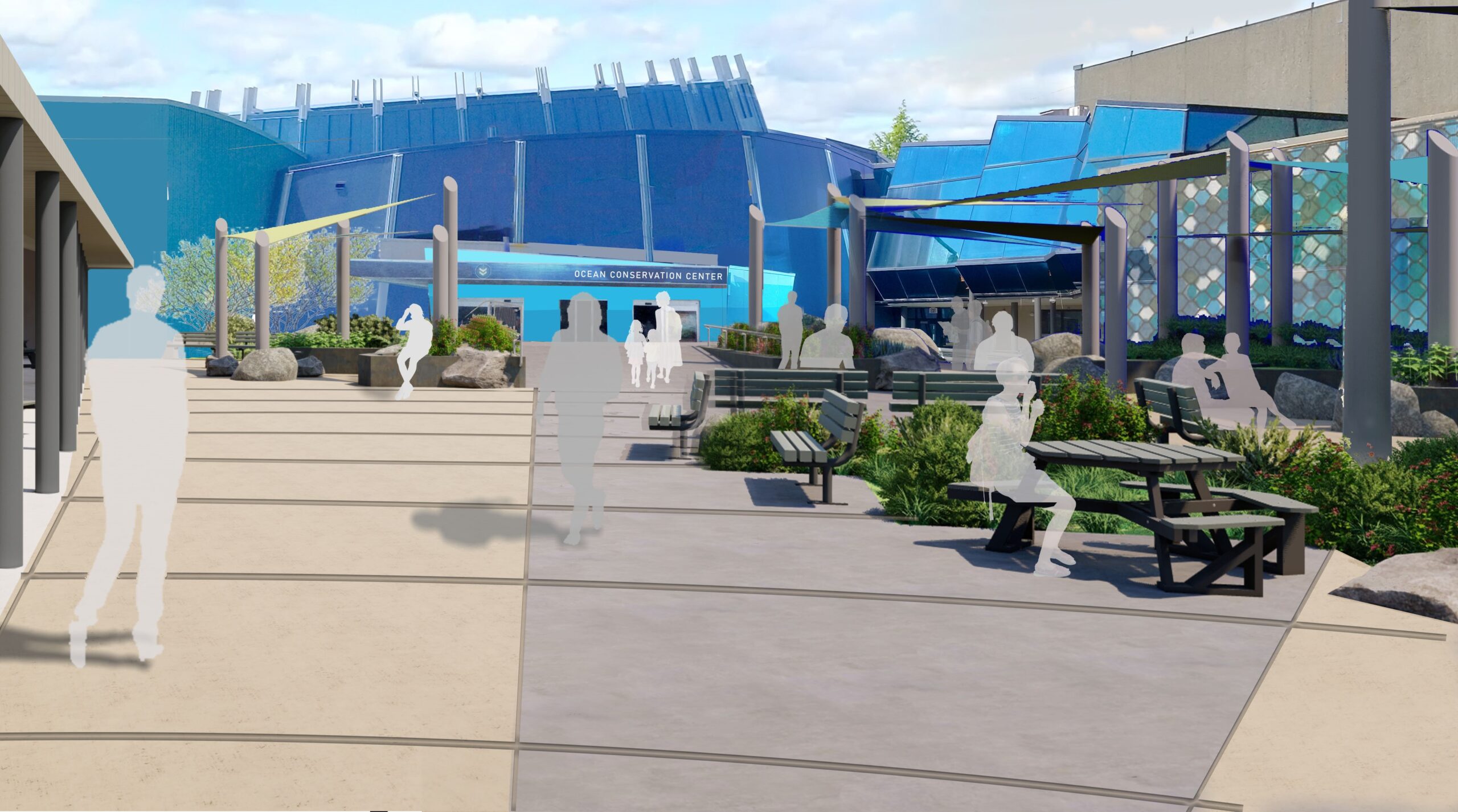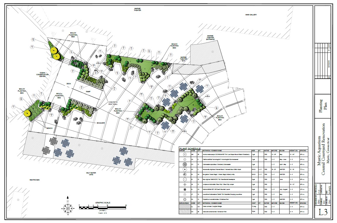 This design meets the goals to provide better user circulation, cleaner site lines, and more informal seating to the central courtyard, while strengthening the overall character of the campus landscape. In order to increase focus on the Ocean Conservation Center, the view from the entry is framed by the creation of seat and planter walls as well as defined bench and picnic table nodes. Visitor experience is visually enhanced through the visual cohesion of repeated materials and patterns and the inclusion of shade sails that are a nod to Mystic’s nautical history. Construction has started with a planned completion by Memorial Day 2023.