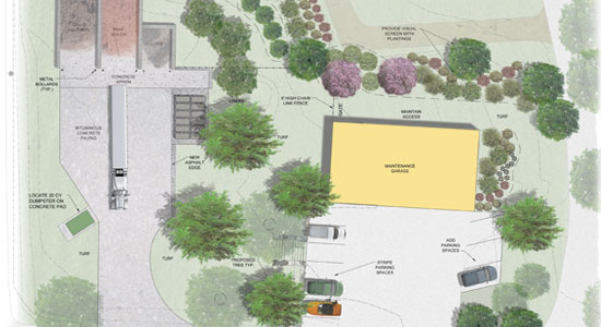With a desire to make available the remaining burial plots in this historic cemetery, a conceptual plan was developed to organize the material and storage yard at the maintenance facility. G+G is providing full design and planning for improved vehicular access to designated materials storage bays, and dumpster pad within a tight space with significant elevation changes. Scope includes providing a lunch area and redesign of the decommissioned loading dock and other building improvements. The facility will be screened with vegetation and fencing in order to enhance quality of projected burial space in adjacent areas.