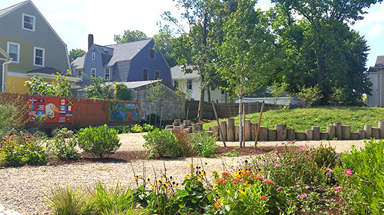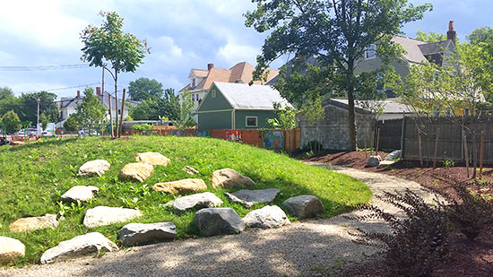 The Providence Parks + Recreation Department acquired vacant parcels adjacent to an active playground in this Elmwood neighborhood. Visionary neighbors sought to transform this land into passive park space to engage a larger user group. Gardner + Gerrish developed plans to include gently sloping pathways surrounding a biomorphic earthen berm. Sustainable elements include striped log retaining/seat wall, native boulder constellations, rain garden to capture stormwater and native vegetation; to both attract wildlife and provide edible landscape and educational community amenity. Plants include fruiting trees, shrubs and ground covers as well as large shade trees for this open site.