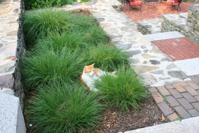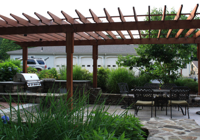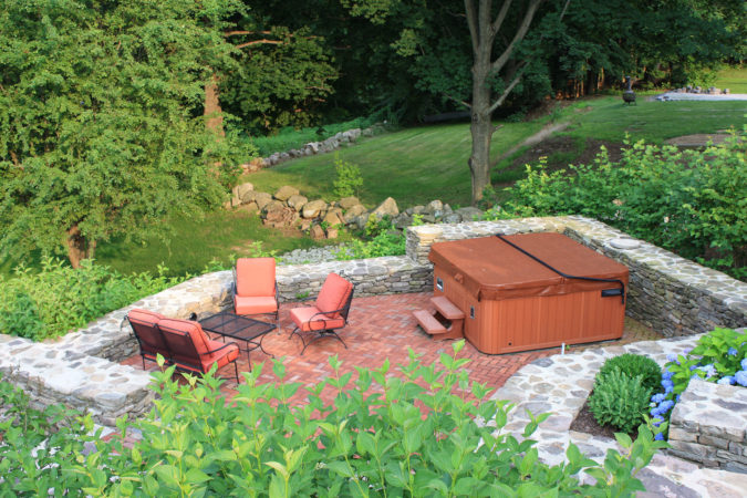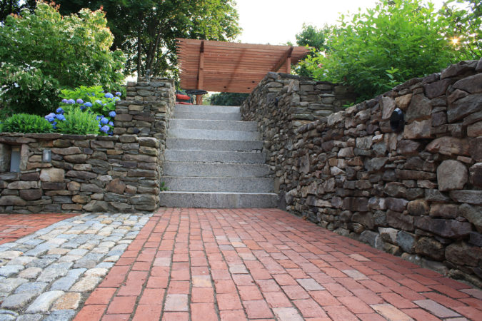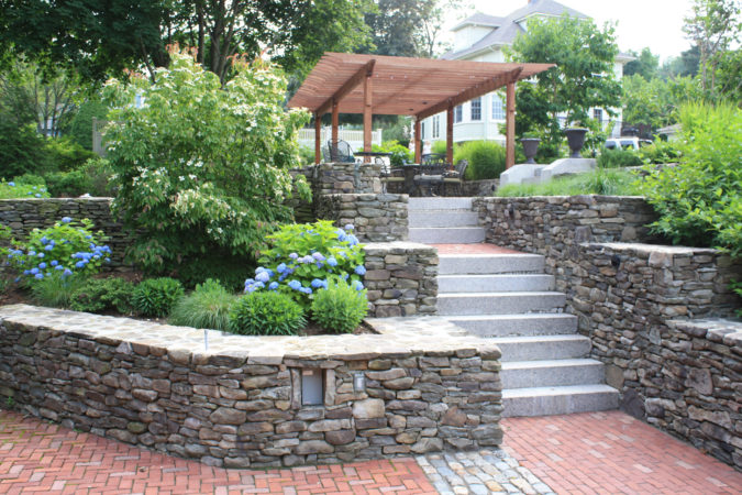 Multiple outdoor terraces were the design result for an existing side yard with a 14’ grade change. Program included dining area with outdoor kitchen and pergola, fire pit, and outdoor spa. Field stone walls and granite stair cases surrounded by native plantings screen neighboring views and soften grade changes between terraced rooms. Client furnished materials that we recycled in creation of the outdoor hardscape areas.