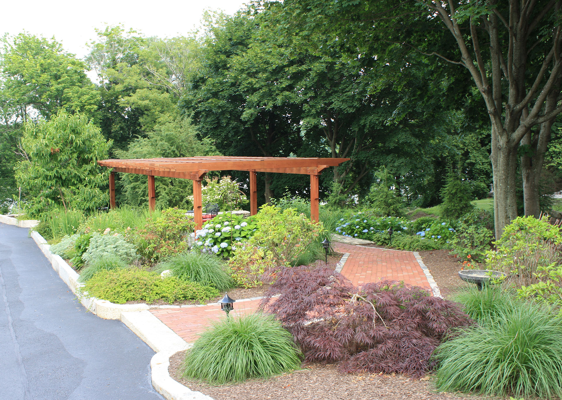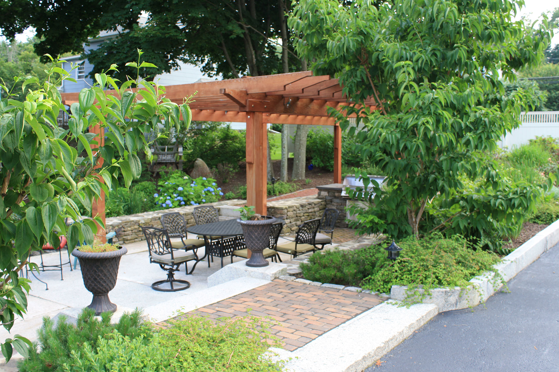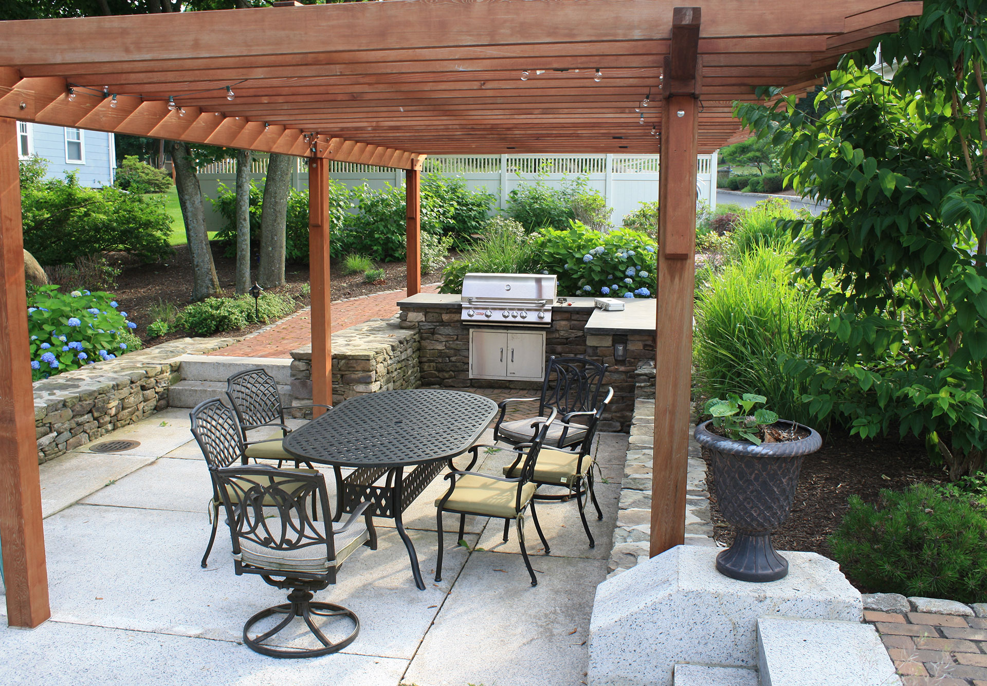 Multiple outdoor terraces were the design result for an existing side yard with a 14’ grade change. Program included dining area with outdoor kitchen and pergola, fire pit, and outdoor spa. Field stone walls and granite stair cases surrounded by native plantings screen neighboring views and soften grade changes between terraced rooms. Client furnished materials that we recycled in creation of the outdoor hardscape areas.