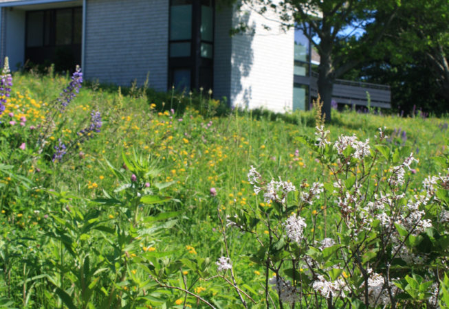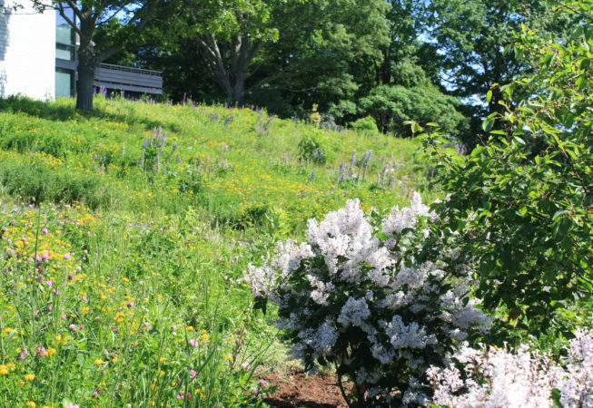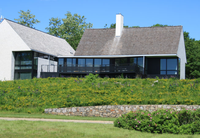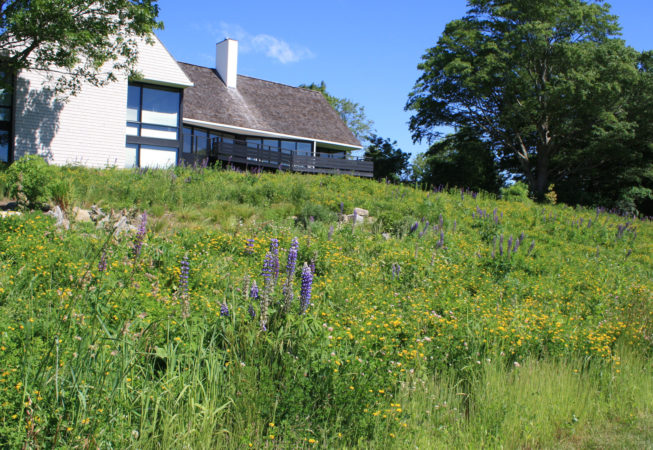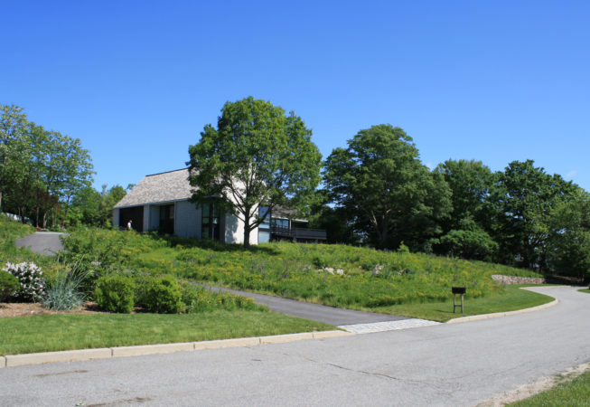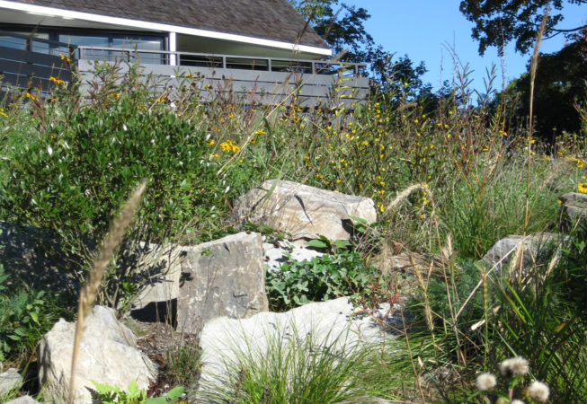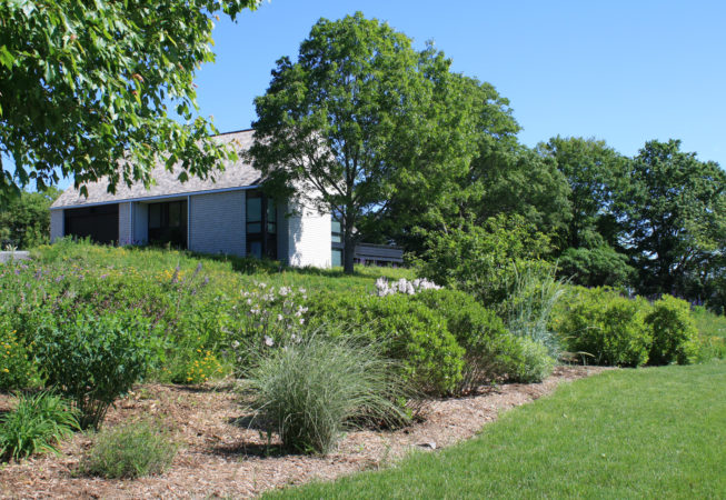 At this bay view residence, native plantings are juxtaposed with bold architectural lines to provide privacy within the client’s sculpture garden. Extensive wildflower meadows grace the front and eastern sides of the house. Sloped dunes encircling a series of rain gardens capture 100% roof runoff and the majority of site surface flow for on-site infiltration. The rain gardens are carefully composed of rock sculptures and wetland meadow plantings. This design allows for full open views from the house, ties the home with the bay and solidifies its location along the coastal zone.