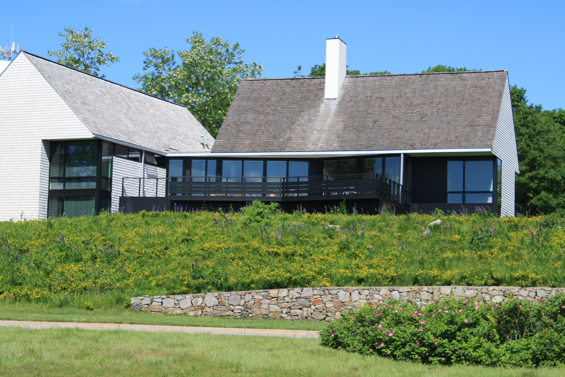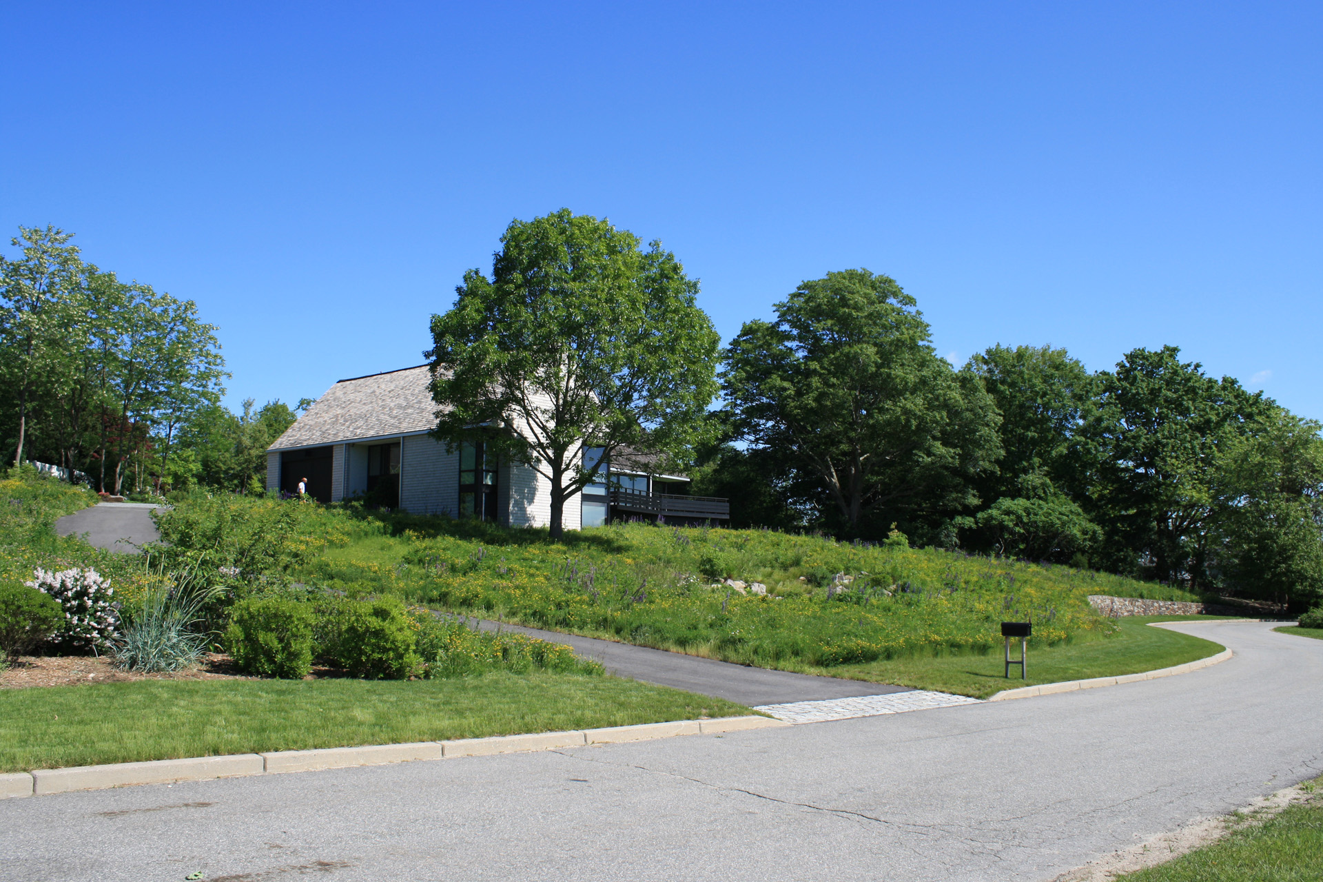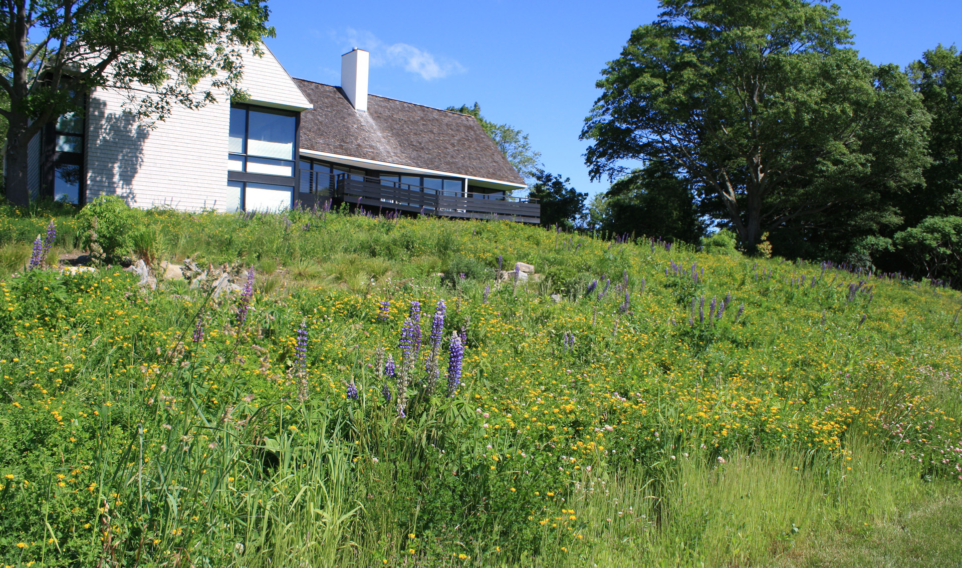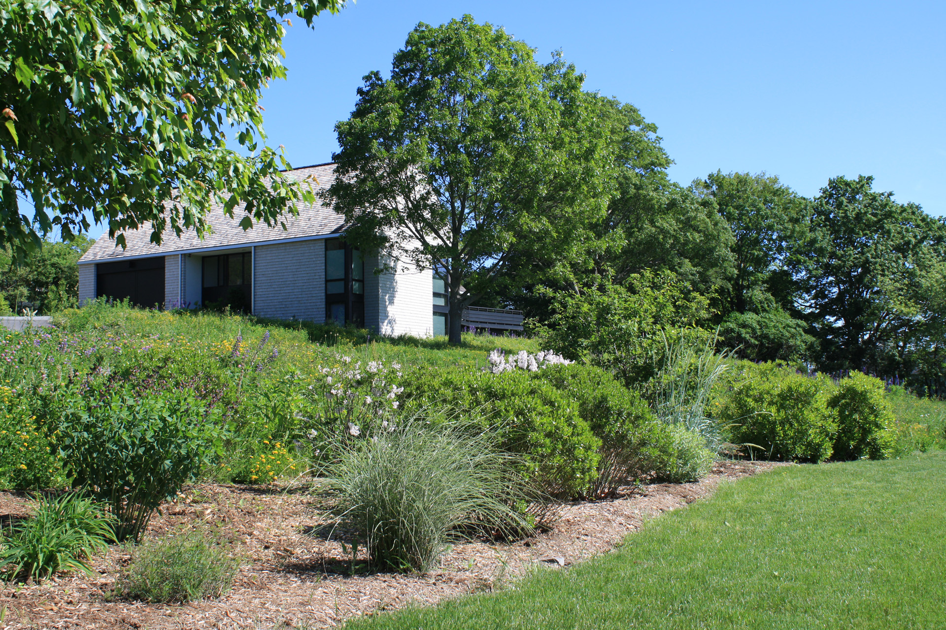 At this bay view residence, native plantings are juxtaposed with bold architectural lines to provide privacy within the client’s sculpture garden. Extensive wildflower meadows grace the front and eastern sides of the house. Sloped dunes encircling a series of rain gardens capture 100% roof runoff and the majority of site surface flow for on-site infiltration. The rain gardens are carefully composed of rock sculptures and wetland meadow plantings. This design allows for full open views from the house, ties the home with the bay and solidifies its location along the coastal zone.