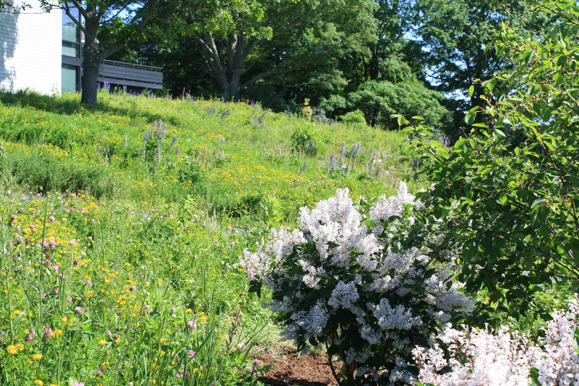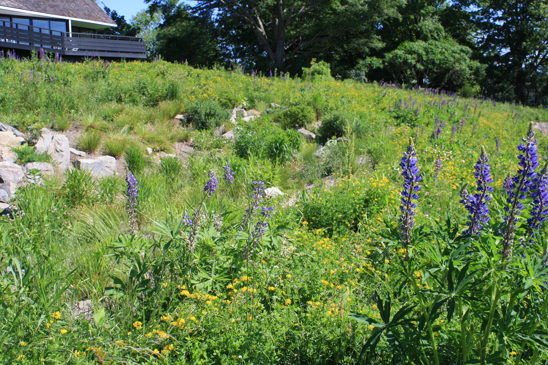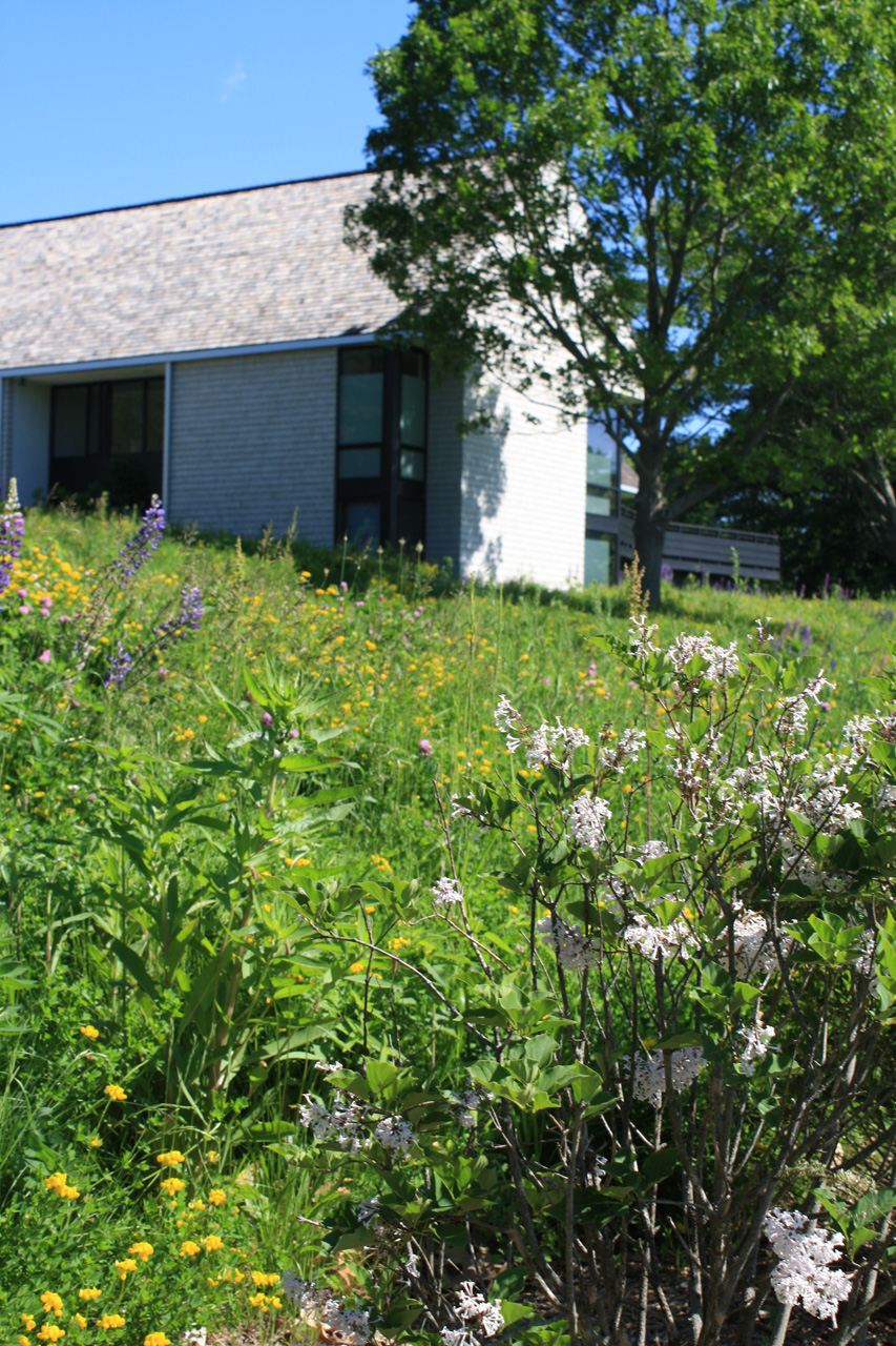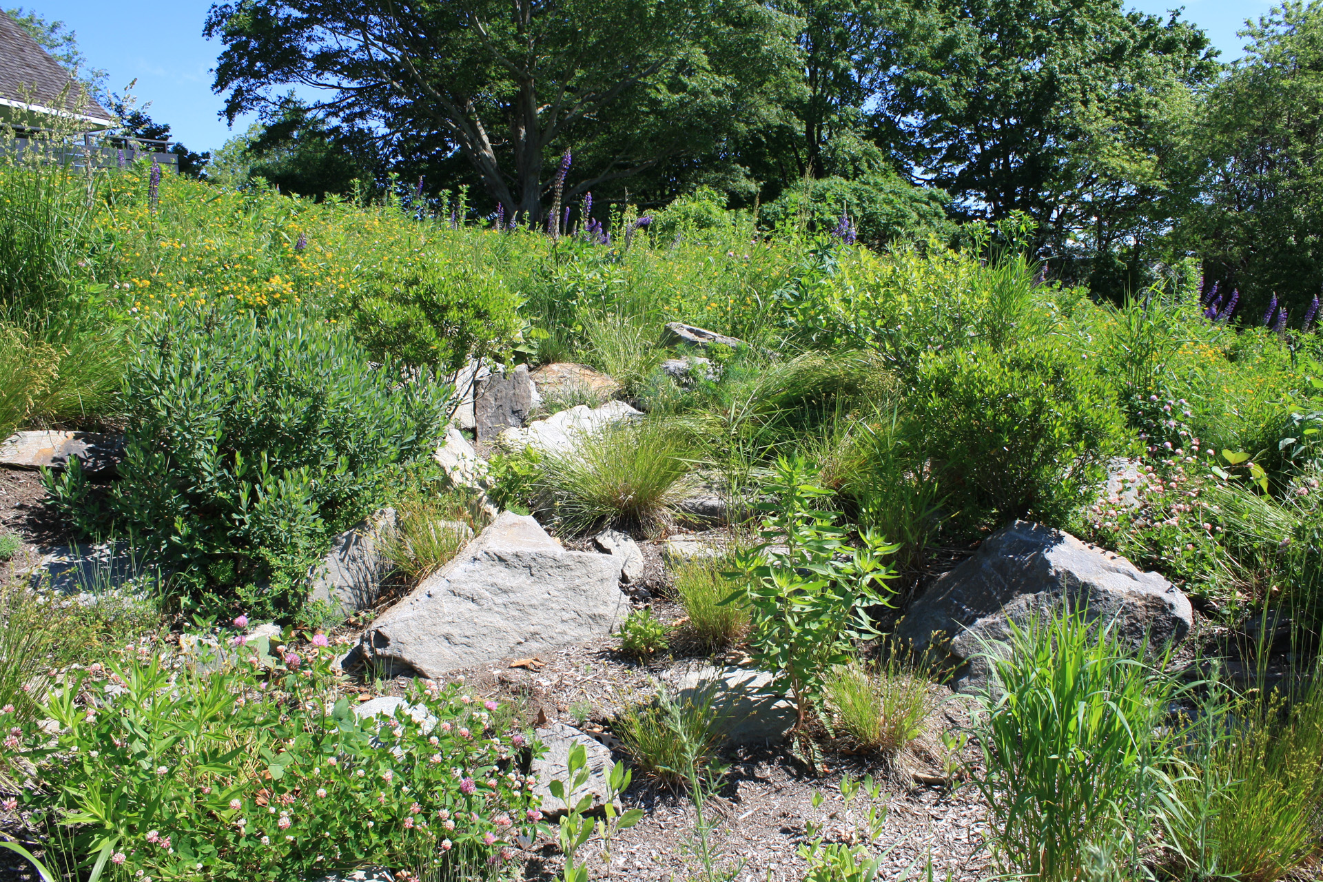 At this bay view residence, native plantings are juxtaposed with bold architectural lines to provide privacy within the client’s sculpture garden. Extensive wildflower meadows grace the front and eastern sides of the house. Sloped dunes encircling a series of rain gardens capture 100% roof runoff and the majority of site surface flow for on-site infiltration. The rain gardens are carefully composed of rock sculptures and wetland meadow plantings. This design allows for full open views from the house, ties the home with the bay and solidifies its location along the coastal zone.