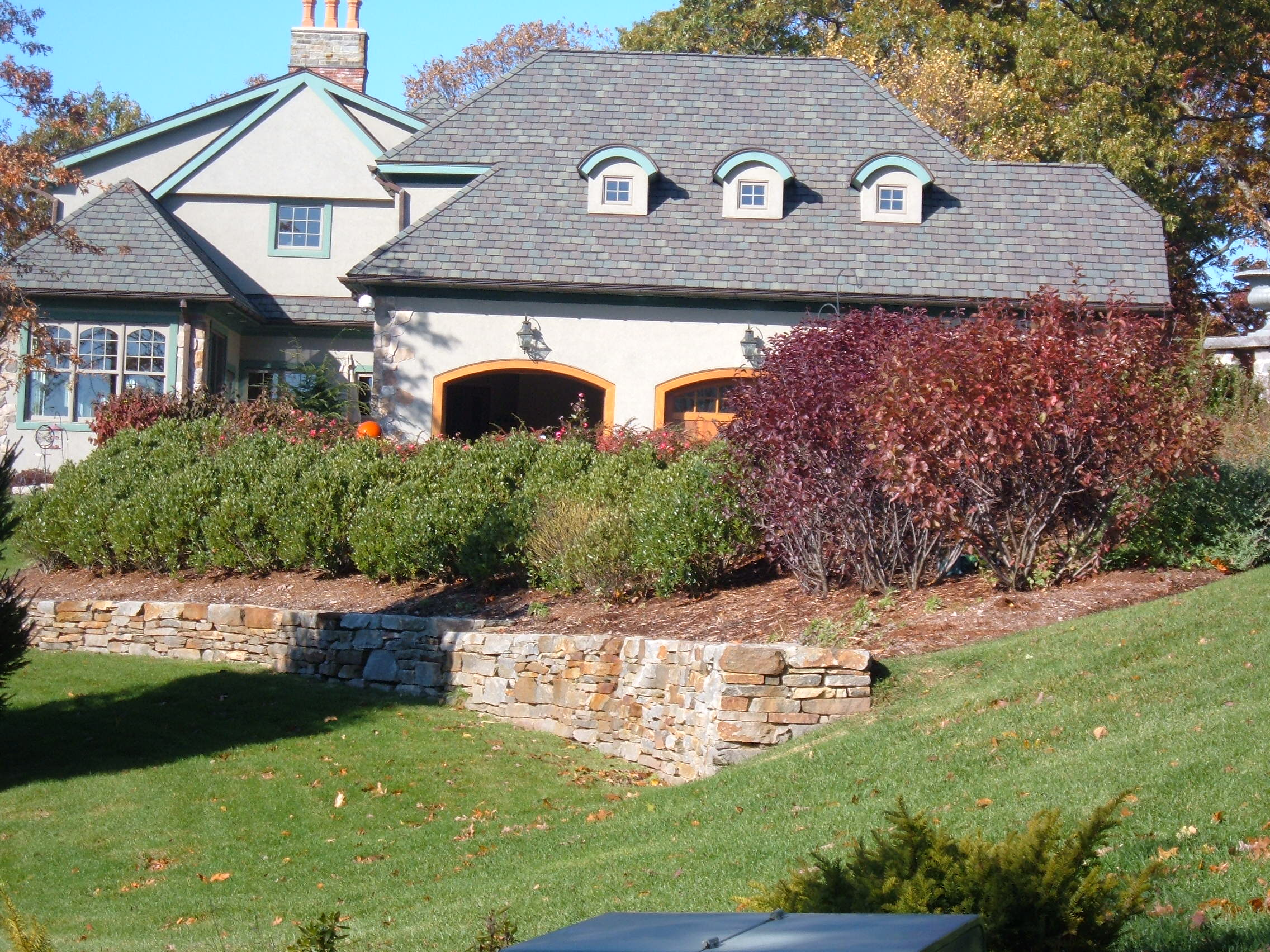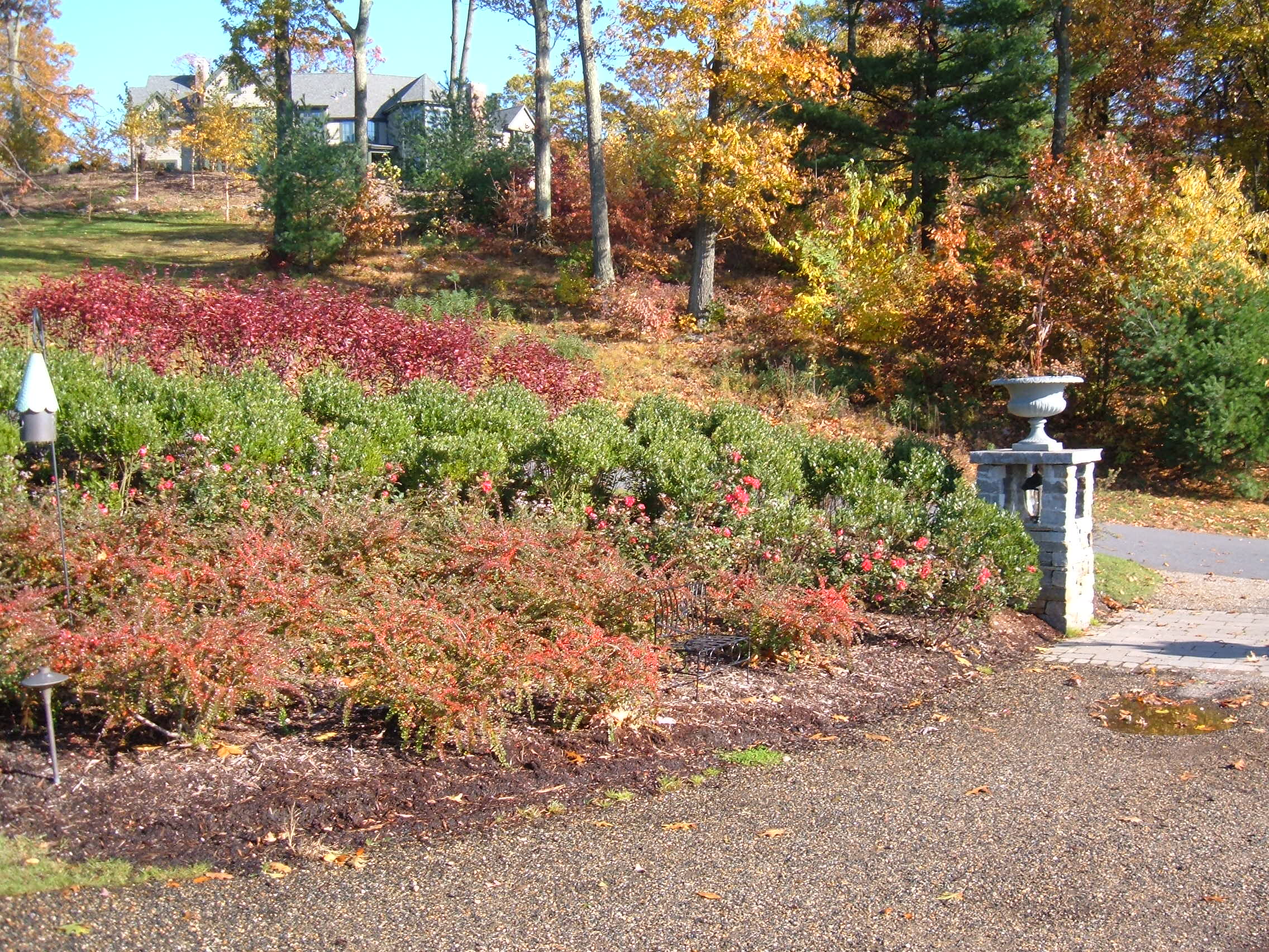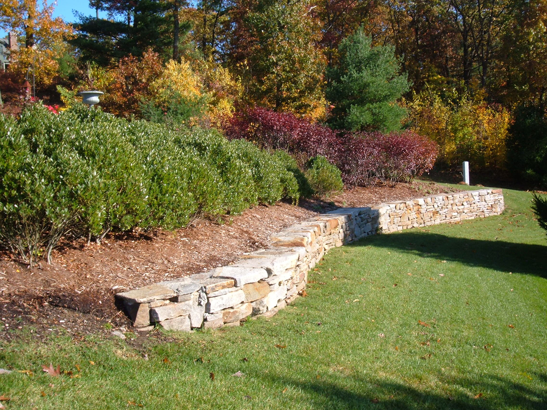 Located in a planned community east of Hartford CT, this project features extensive stone retaining walls to create usable outdoor space. Native plantings frame distant views from the deck and patio space, while additional plantings enhance the entry sequence and define circulation corridors. A majority of the plantings were of large dimension providing a more mature character to the landscape.