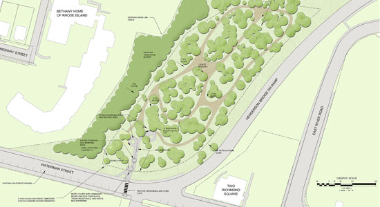 Per request of the Providence Parks Department, Gardner + Gerrish designed and obtained permitting for a 2.5 acre off-leash dog park on the East Side of Providence. The park is a longtime vision of local residents and an effort to mitigate environmental damage to the nearby Blackstone Park where dogs currently run. The entire perimeter will be enclosed with fencing and include an area for smaller dogs, a canine drinking fountain, agility course area, and seating within the wooded lot. Many invasive plant species have been removed and long terms goals include invasive plant management and native plant species recovery. Park opened spring 2016.